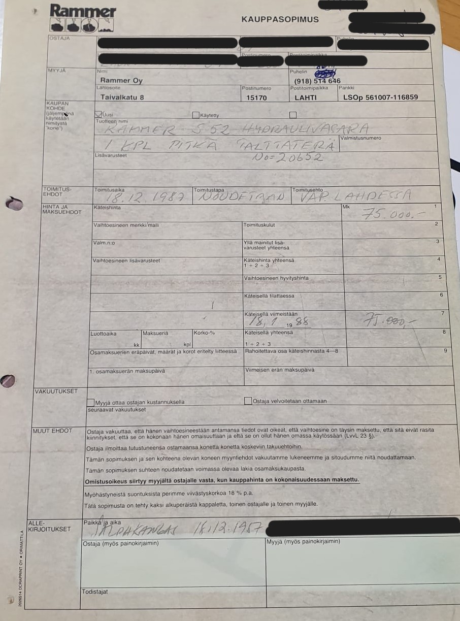 Vähäisellä käytöllä ollut keski-ikään kerinnyt Rammer. Alkuperäinen ostokuitti vuodelta 1987 löytyy mukaan. Takuu ehtinyt jo umpeutua.
