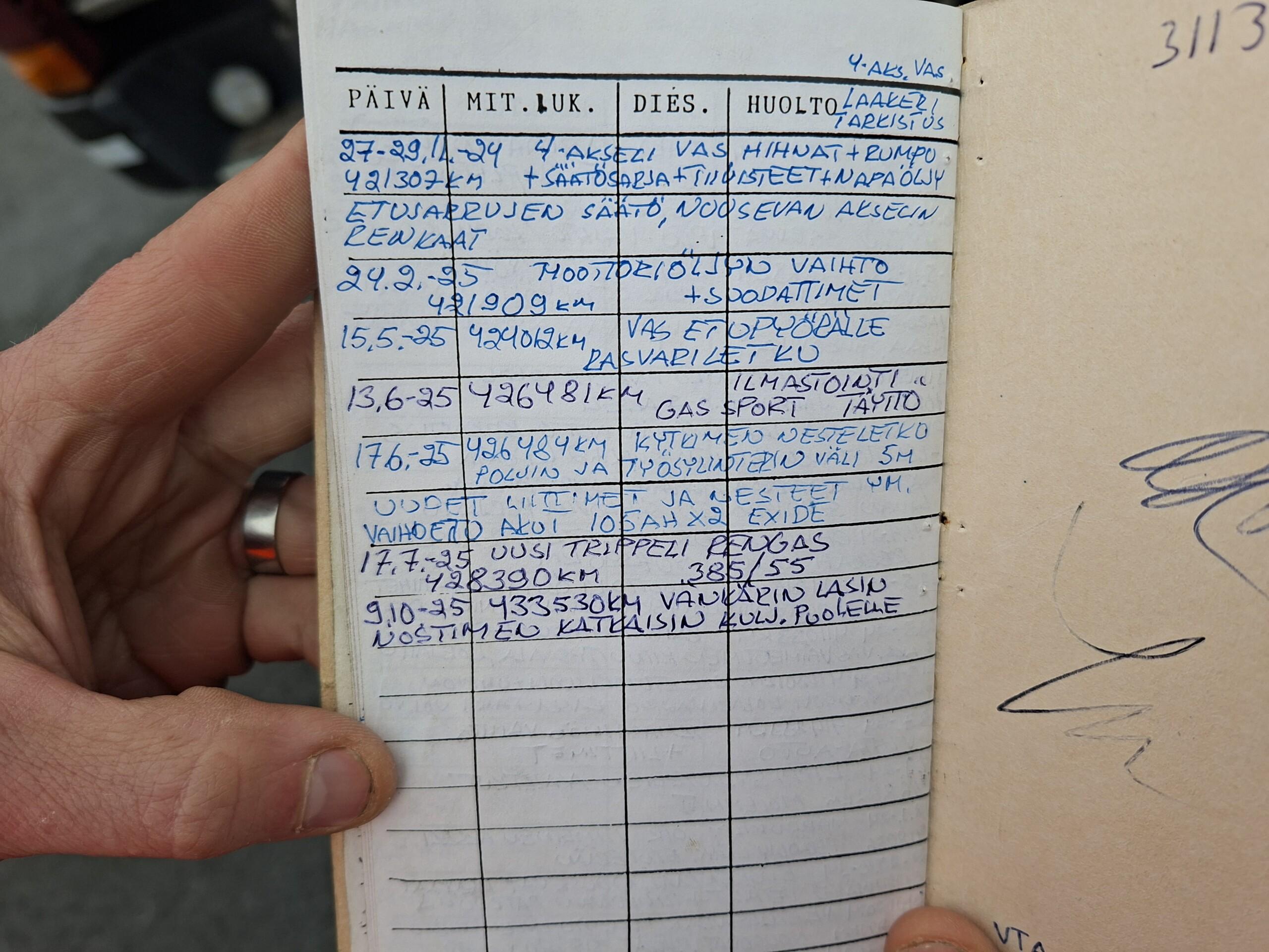 Kaikki korjaukset ja huollot huoltokirjassa.