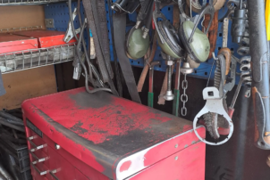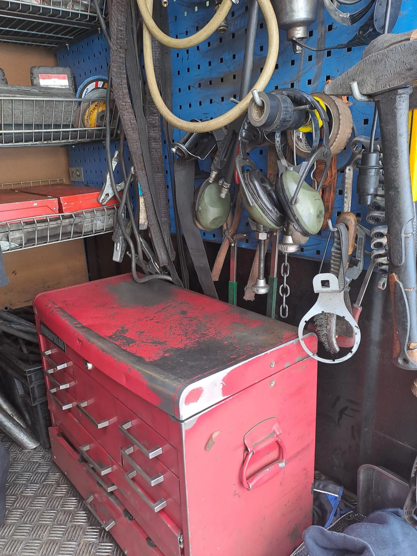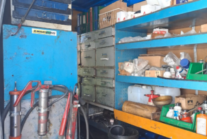 Työpöytä, varaosalaatikot, hyllyt, ruuvipenkki, kompura